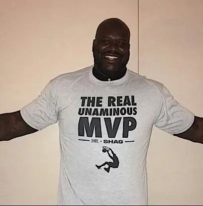 Spell check anyone? Shaq shows off his MVP tee.