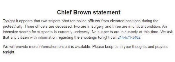 The shootings took place as a rally and march in downtown was ending. The rally was held to show solidarity with communities affected by officer-involved shootings this week in Louisiana and Minnesota.