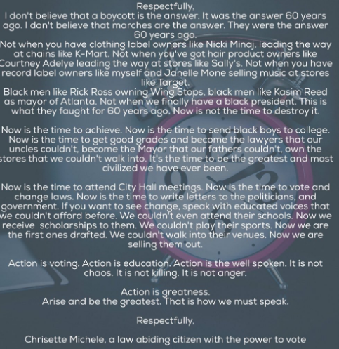 I agree with her to a point but at the same time she has fallen into the white mans mentality it’s all about my money. One of the problems with black people now days is we have had to work ten times harder then whites to achieve anything and we will do anything to hold on to it. With all the money circulating in Blackwood you would think they would unify themselves and start up their own chain of department stores where they can distribute and sell their own products while creating jobs for the black community. All these rappers and celebrities have a tennis shoe line, cosmetic line, clothing line, perfume line….ect. and they can’t come together and build an empire of department stores. Blacks can not come together unless it’s sports, music or they want to get overly emotional about an racial issue and tear their own community down. We will be fighting racism as long as we are on this earth, we have got to come together on an everyday basis and support one another and not have the attitude “I have mine and you have yours to get, I am happy with me and my three and let me be.” Chrisette Michele is more worried about loosing a dime then saving a life….these black rappers, athletes and celebrities should be the first ones to boycott and pull their merchandise from these stores.They can sell their merchandise online they already have a fan base and don’t necessarily need these conglomerates to move their merchandise other then greed and wanting to take every avenue available to make a dollar. “We need to come together not just when there is a tragedy but everyday.” “Black lives and all lives matter.”