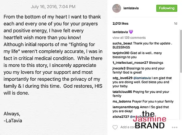 LaTavia Roberson has broken her silence, giving fans an update about her health. Earlier this month, there were rumors that the former Destiny’s Child singer/reality star had a medical emergency related to her pregnancy and was “fighting for her life”. Over the weekend, she released the following statement: