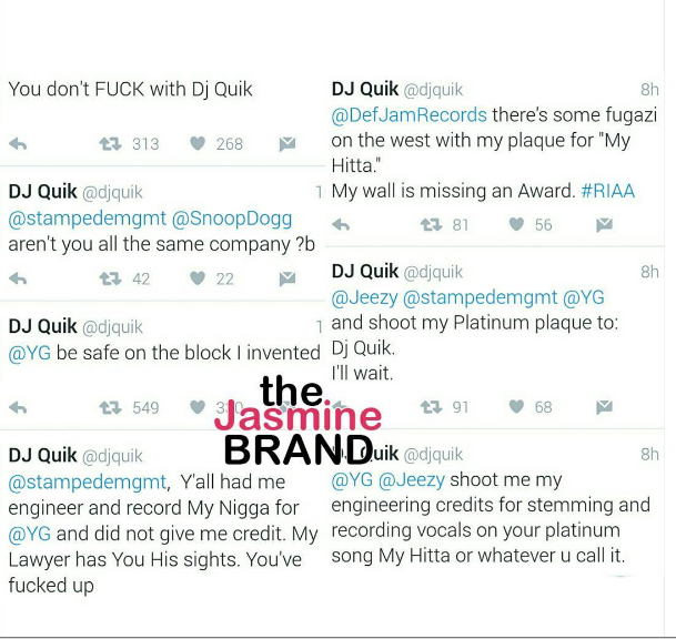 DJ Quik has taken to social media, calling out rapper YG, Def Jam Records and rapper Jeezy over not being properly credited for a track that he produced. Check out Quik’s tweets below, which he later deleted.
