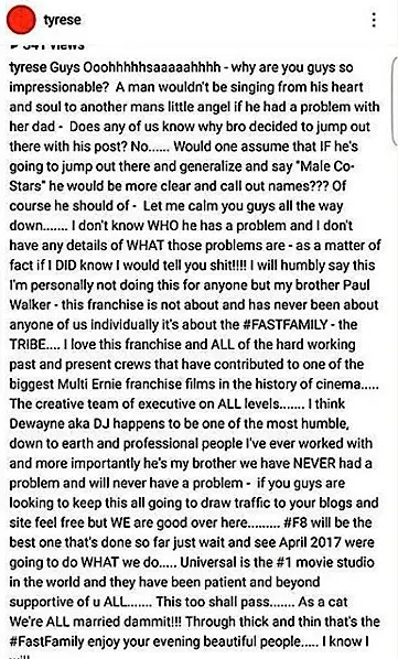 It’s all love between Tyrese and The Rock (Dwayne Johnson). As you know, earlier this week, The Rock posted a lengthy Instagram message, slamming one of his ‘Fast & Furious’ male co-stars. [Click here to read his message.]