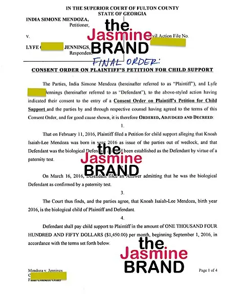 Per the agreement, Lyfe will pay $1,450 a month in support to India for their newborn.