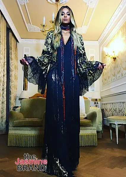Ciara serves bohemian chic fashion, wearing Roberto Cavalli.