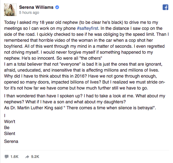 Today, Serena Williams shared a powerful message on her official Facebook page, about the rising tension surrounding police brutality. The lengthy post was written when she became nervous after seeing a police officer on the road. She writes: