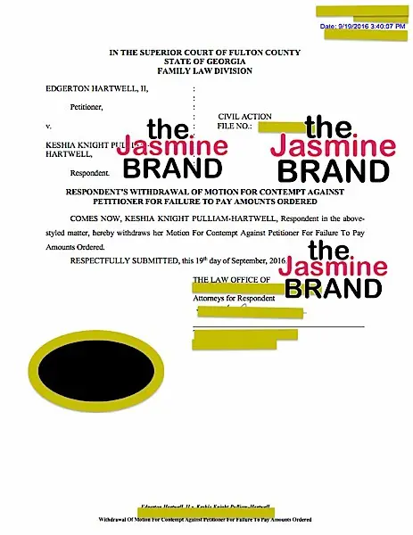 Here’s the latest: On September 19th, Pulliam returned to Georgia Court in her nasty divorce battle and informed the court she is withdrawing her motion to find Hartwell in contempt. Based on the docs, it appears that the former NFL star decided to finally cut the check for the money he promised to pay her. It appears the two are working out their issues but, the divorce case is still proceeding in Fulton County Court.