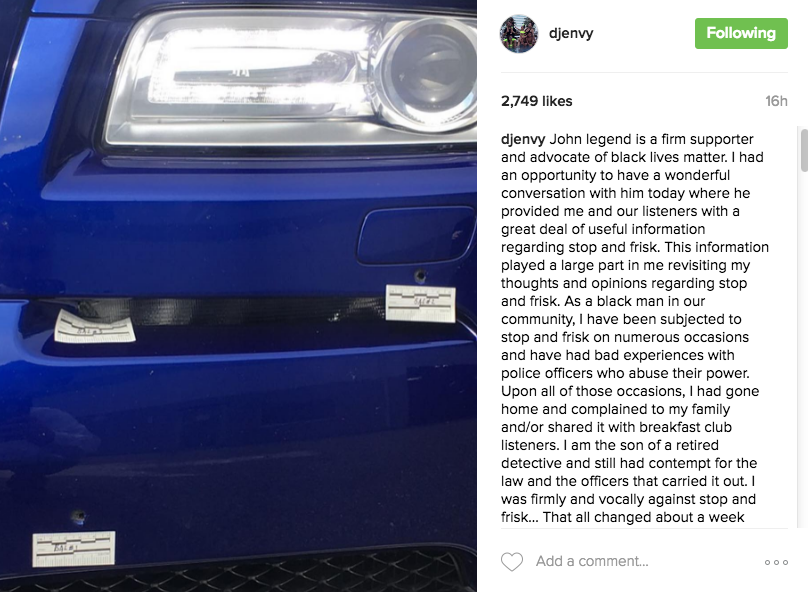 John legend is a firm supporter and advocate of black lives matter. I had an opportunity to have a wonderful conversation with him today where he provided me and our listeners with a great deal of useful information regarding stop and frisk. This information played a large part in me revisiting my thoughts and opinions regarding stop and frisk. As a black man in our community, I have been subjected to stop and frisk on numerous occasions and have had bad experiences with police officers who abuse their power. Upon all of those occasions, I had gone home and complained to my family and/or shared it with breakfast club listeners. I am the son of a retired detective and still had contempt for the law and the officers that carried it out. I was firmly and vocally against stop and frisk… That all changed about a week ago when someone tried to MURDER me in an attempted robbery and carjacking… I was shot at several times with an illegal gun . Thankfully, through the grace of God, I was able to escape with my life and go home to my family. It was as though a ton of bricks fell from the sky and gave me a different perspective on stop and frisk based on my experience. The only thing that I could think is that these streets aren’t safe and that illegal guns need to be removed. I have been on both sides of the equation… A person reduced to being stopped and frisked and a person who’s life was almost taken from him with an illegal gun. I said that stop and frisk could be an option if it could be administered PROPERLY and FAIRLY. Voicing that opinion created a much-needed discussion about the topic. It angered a lot of people and causd a surge of information to rise to the surface… some information that I was not aware of previously… After several conversations within my community with @johnlegend and with my wife, I am not too proud to say that my views on Stop and Frisk have changed.. I spoke too soon..