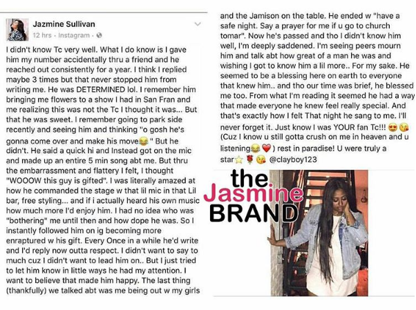 Jazmine Sullivan recently found herself trending on Twitter and not for a good reason. The soulful singer penned a message after learning that a fan, who happens to also be a singer, had passed. In the message, she recounts how they met and her fondest memory of him. See her message below.