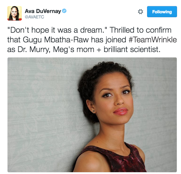 Gugu will play the role of Dr. Murry — Meg and Charles Wallace’s mother. She is a scientist who, with Meg’s father, comes up with the notion of the wrinkle in time. Mbatha-Raw was most recently seen in “Free State of Jones” and will star next in Bad Robot’s “God Particle.” She will follow that up with Disney’s “Beauty and the Beast” in the role of feather duster Plumette.