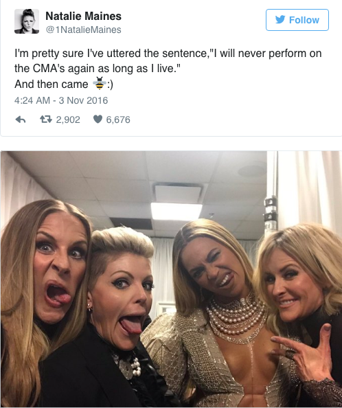The Dixie Chicks were also omitted. (FYI: The Dixie Chicks were said to be shunned by the country world because of their comments against then-President George W. Bush and feud with country star Toby Keith years ago.) The Dixie Chicks member Natalie Maines hinted that she was even surprised that they performed at the CMAs again.