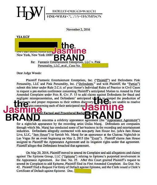 Here’s the latest: On November 2nd, Fantastic Entertainment Enterprises filed docs in the case explaining they now believe Nicki conspired to defraud them out of $200k. The company says they uncovered new evidence regarding Nicki’s relationship with Epitome – the company she said she didn’t know previously.