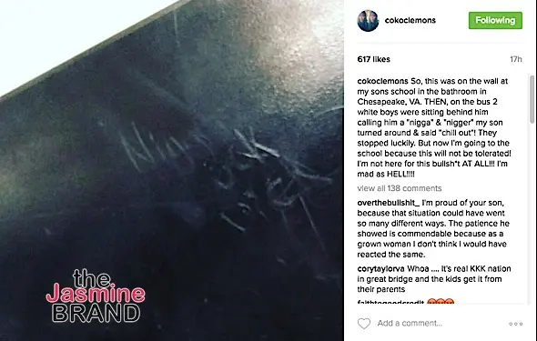 Unfortunately, racism is real and each day people of color are reminded of this. Today, SWV singer Coko Clemons shared a personal story about how her son is being taunted in school by racist students. She shared a disturbing photo of something that was found in the bathroom at her son’s school and also revealed that he had been called n*gga by another student. She wrote: