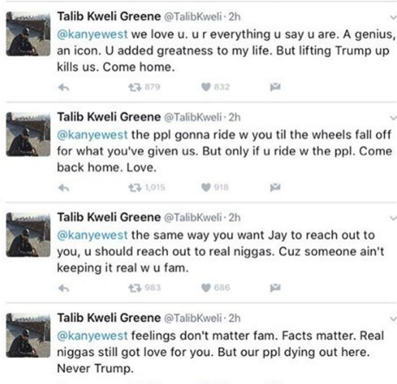On Sunday, rapper/activist Talib Kweli, who has worked with Kanye in the past openly, criticized him and told him to ‘come home’. Check out the tweets below.