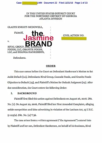 Here’s the latest: On November 21st, the judge came back with his decision and sided with Glady’s son (Shanga Hankerson) and shut down Gladys’ attempt to move forward with her default. The order allows her son to continue on defending himself in the case.