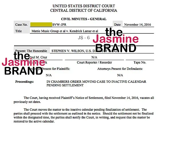 Here’s the latest: On November 14th, docs were filed in the case by the plaintiff explaining they reached a settlement with Kendrick. The provisions of the deal will remain confidential but they have settled the entire case. Per the deal, the legal battle will be closed forever.
