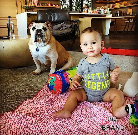 Chrissy Teigen and John Legend’s daughter Luna poses with their family dog.