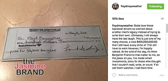 Floyd Mayweather, Jr. is flaunting his wealth on social media. After the video leaked of him dancing with Tameka ‘Tiny’ Harris, he posted a photo of a $100,000 check writing: