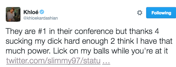 She’s becoming one of the top Clap Back Queens of 2016! Khloe Kardashian is making headlines for inviting a fan to her private parts. The KUWTK reality star, who is dating Cavs player Tristan Thompson, politely read Twitter user named slimmy97 after telling her that the