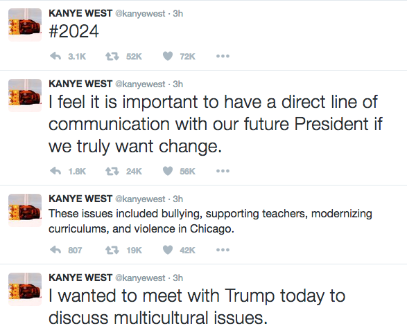Social media erupted Tuesday morning, after Kanye West visited President Elect Donald Trump in Manhattan. There was much speculation as to why the pair met, but ‘Ye has hopped on social media giving fans an explanation. See his tweets below.