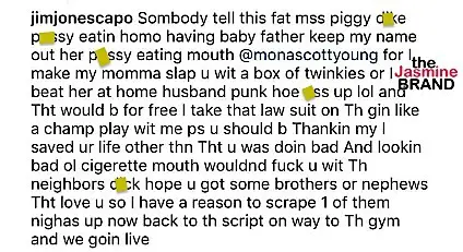 Sombody tell this fat mss piggy d*ke p*ssy eatin homo having baby father keep my name out her p*ssy eating mouth @monascottyoung for I make my momma slap u wit a box of twinkies or I beat her at home husband punk hoe *ss up lol and Tht would b for free I take that law suit on Th [sic] gin [sic] like a champ play wit me ps u should b Thankin my [sic] I saved ur life other thn Tht u was doin bad And lookin bad ol cigerette mouth wouldnd f*ck u wit Th neighbors d*ck hope u got some brothers or nephews Tht love u so I have a reason to scrape 1 of them nighas up now back to th script on way to Th gym and we goin live.