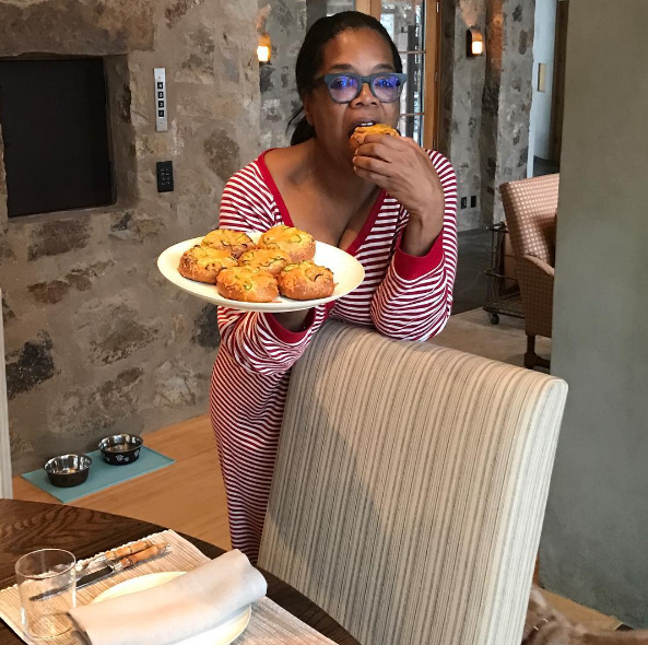 Oprah, who has endorsed Weight Watchers, LOVES bread. Here, she enjoys hot out of the oven jalapeño cheese bagels – yum!