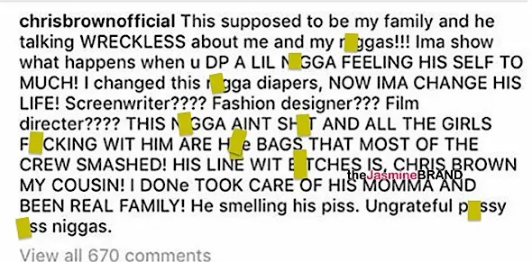 Chris Brown is livid with one of his cousins. Recently, the 27-year-old singer took to Instagram, literally airing out his relative out who goes by the name Austin Santana. No word on what triggered Chris’ drag session, but C-Breezy actually threatened physical harm over him speaking reckless about him and his friends. See Chris’ IG comment below.