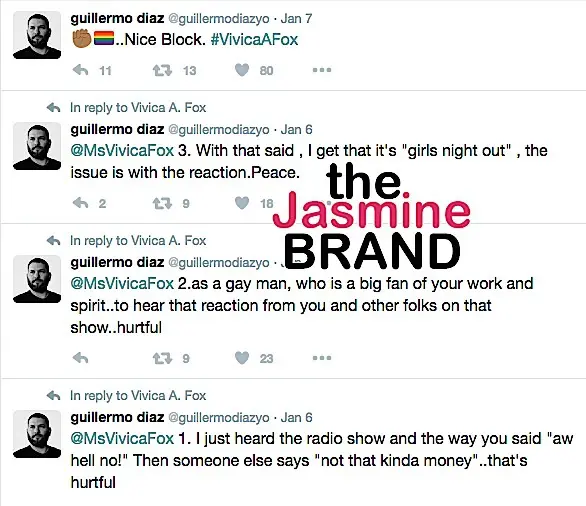 Actor Guillermo Diaz says he is hurt by a comment/reaction that Vivica A. Fox made while promoting her new Lifetime reality show, Vivica’s Black Magic. The openly gay actor took to Twitter, tweeting the actress: