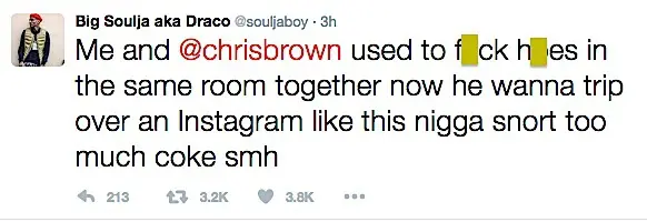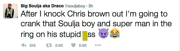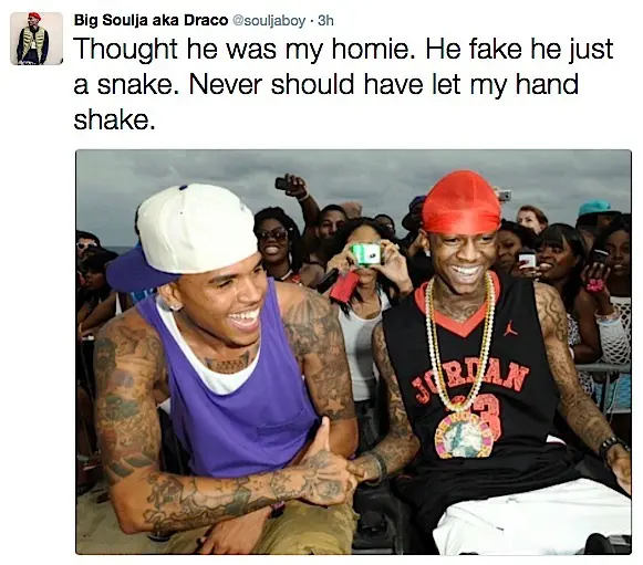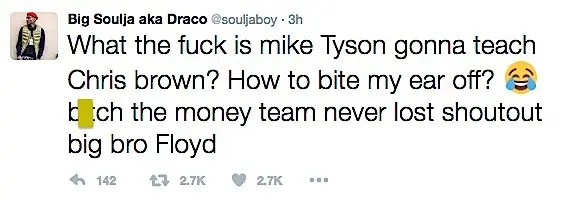 Soulja Boy is unimpressed that Mike Tyson is training Chris Brown for their upcoming celebrity boxing match. Over the weekend, Soulja hopped on Twitter expressing this, along with hurling some insults at the singer. He also added that he’s fighting Chris in retaliation for him physically attacking his then girlfriend Rihanna back in 2009. See his tweets below.