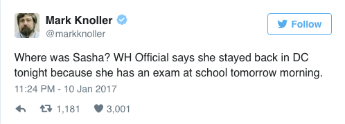 Where was Sasha? WH Official says she stayed back in DC tonight because she has an exam at school tomorrow morning.