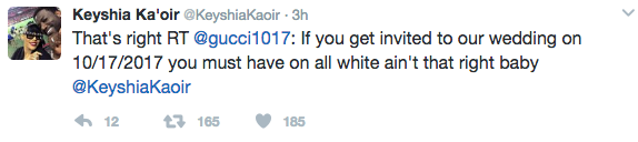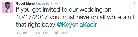 If you’re lucky enough to receive a wedding invitation to Gucci Mane’s upcoming nuptials, there’s one small fashion request: white. As you know, the 36-year-old rapper and his fiancee Keyshia Ka’oir are saying ‘I Do’ this year. This week, Gucci tweeted if you’re attending their special day, you must wear white. He tweeted,