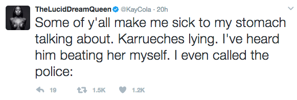 Chris Brown’s neighbor claims that on a number of occasions, she heard the singer physically assault Karrueche Tran. A recording artist named KayCola claims that she lived downstairs from the singer and often heard Karrueche screaming. She also says that the police were called on multiple times as well. She tweeted about the situation. Check it out below.