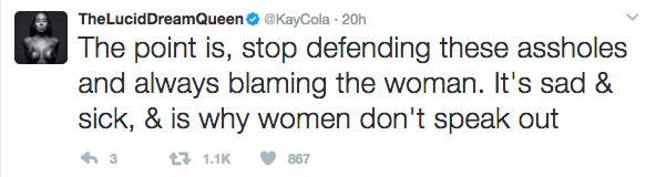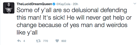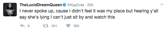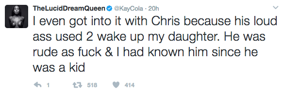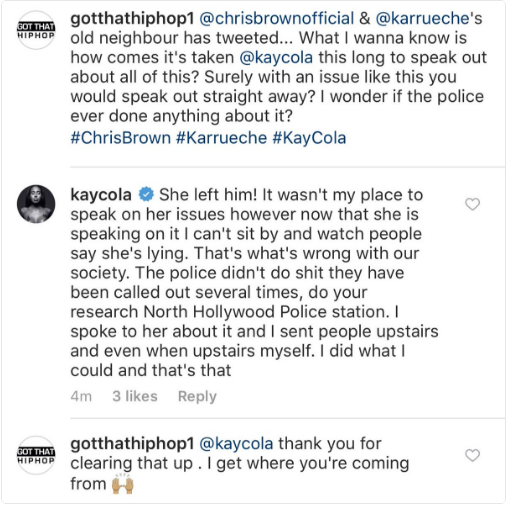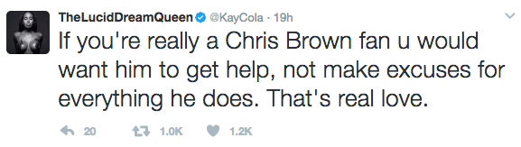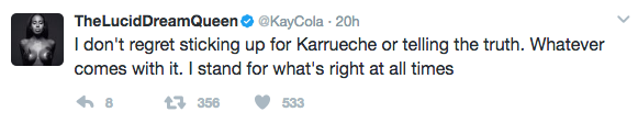 KayCola’s tweets are in response to Karrueche receiving a restraining order on her now ex-boyfriend. Click here for the backstory.