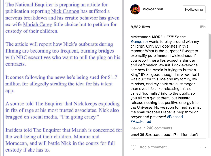 Nick Cannon is threatening to sue The Enquirer, over a potential story claiming that he is suffering a nervous breakdown and his ex-wife Mariah Carey will petition for custody of their children. The TV host/comedian/artist posted the story on social media, threatening to sue the outlet for slander. He writes: