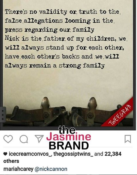 There’s speculation that Mariah’s message is in response to the alleged story that the National Enquirer had planned to run. The rumored story was said to claim that Mariah was concerned over Nick’s mental health and that she was considering suing him for full custody of their 5-year-old twins, Monroe and Moroccan. Click here for more.