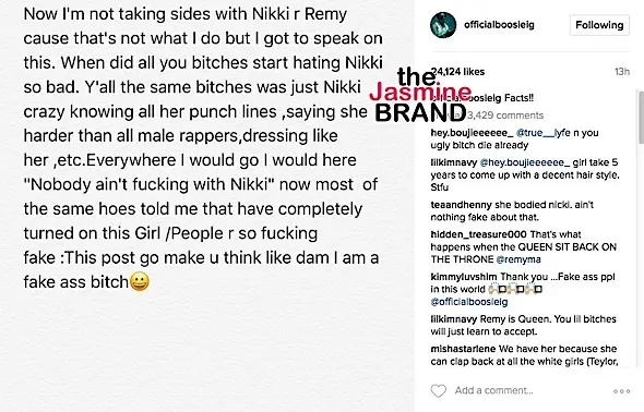 Boosie has taken to social media, defending Nicki Minaj. The 34-year-old rapper posted a message suggesting that some women are fake for now hating on Minaj, after Remy Ma released her ‘Shether’ diss track. See his post below.
