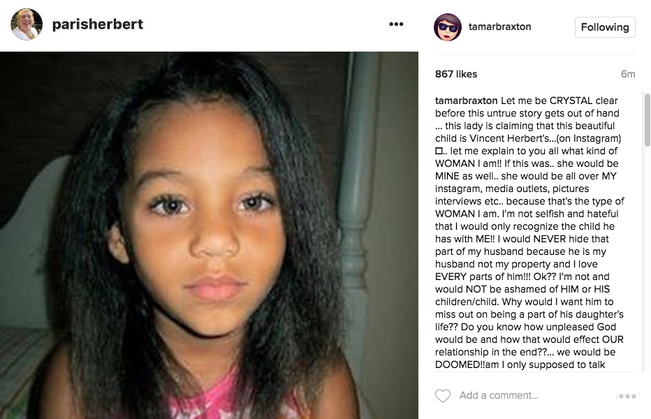 A woman is claiming that she secretly had a 7-year-old daughter with music producer Vincent Herbert, who is married to singer and reality star Tamar Braxton. The mother of the alleged child posted a photo of the child claiming that she and Vincent had a one night stand the evening before his wedding to Tamar. The mother writes: