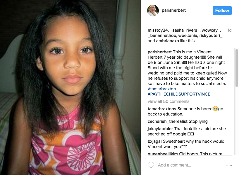 This is me n Vincent Herbert 7 year old daughter!!!!! She will be 8 on June 28th!!!! He had a one night Stand with me the night before his wedding and paid me to keep quiet! Now he refuses to support his child anymore so I have to take matters to social media. #tamarbraxton #PAYTHECHILDSUPPORTVINCE