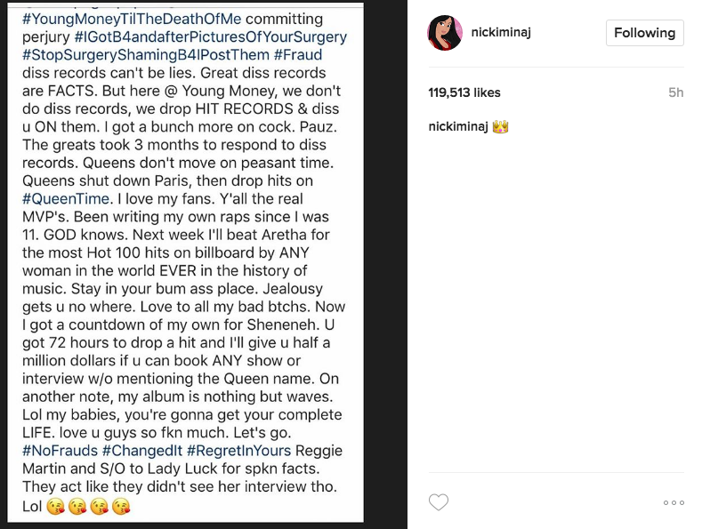 Nicki also gives Remy 72 hours to respond with a hit record and offers Remy half a million to book a show or do an interview without mentioning her name.