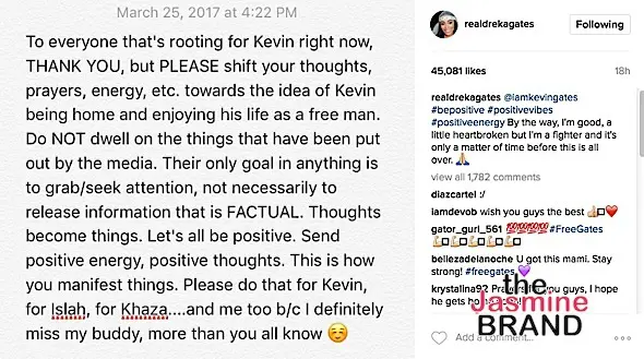 Kevin Gates’ wife, Dreka, is asking for people to send positive thoughts and vibes to her husband, rapper Kevin Gates. Over the weekend, she posted a message to social media, telling his fans to NOT dwell on the things that the media has posted about him, but focus on positive energy. See her statement below.