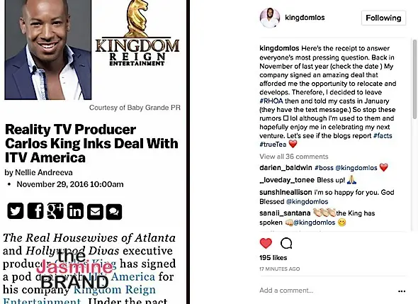Executive producer Carlos King has confirmed the rumors of his departure from the Real Housewives of Atlanta. On Sunday (April 9th), he shared that his company had inked a new deal and that he informed the RHOA cast in January that he was leaving the show. Sharing the news on social media, he writes: