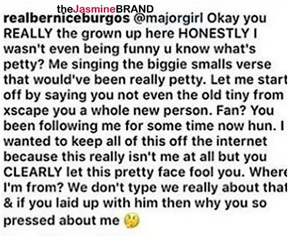 Okay you REALLY the grown up here Honestly I wasn’t even being funny u know what’s petty? Me singing the biggie smalls verse that would’ve really been petty. Let me start off by saying you not even the old tiny from xcape you a whole new person. Fan? You been following me for some time now hun. I wanted to keep all of this off the internet because this really isn’t met at all but you CLEALY let this pretty face fool you. Where I’m from? WE don’t type we really about that & if you laid up with him then why you so pressed about me?