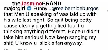 Funny @therealberniceburgos that man u speaking of was laid up with his wife last night. So quit being petty cause clearly u getting lied too [sic] if u thinking anything different. Hope u didn’t take him serious! Now keep sanging my sh*t! U know us slick a fan anyway.