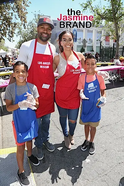 Derek Fisher, Gloria Govan and her twin sons volunteer for Los Angeles Mission Easter Event for Skid Row Homeless.