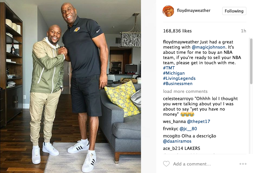 Floyd Mayweather is ready to buy an NBA team. Today (May 4th), the former boxing champ met with Magic Johnson and shared a photo writing: