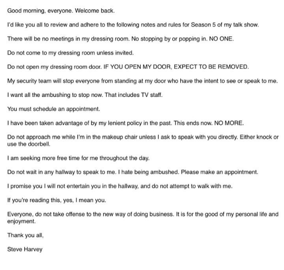 An alleged internal email that Steve Harvey sent to the staff at his talk show, has gone viral. The email was reportedly sent at the beginning of the current season. In it, Harvey instructs the staff that they should make an appointment if they want to see him, as opposed to waiting on him in the hallway, ambushing him while he’s in dressing room, etc. In short, he’s not a fan of pop-up visits. Check out the alleged email below.