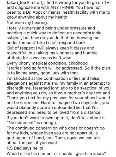 Takari caught wind of her mother’s comments and posted a lengthy response, stating that she does not suffer from depression, adding: