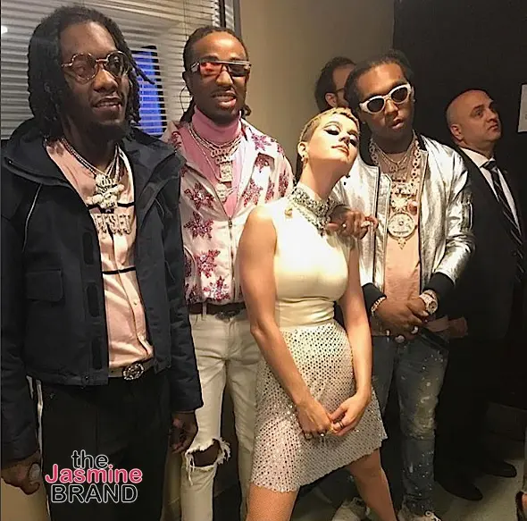 Katy Perry poses with Migos backstage, after performing with the group on Saturday Night Live (SNL).
