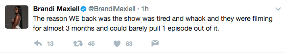 Fast forward to the present day and tension between Brandi and some of the cast members is at an all time high. After Monday night’s episode aired, Brandi hopped on social media, claiming that production ‘begged’ for both her and Malaysia to return to the show because it was ‘wack’ without them. See a few of her tweets about this below.