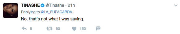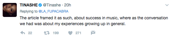 Tinashe is responding to backlash over comments that she made in a recent interview. In the interview, Tinashe discussed being bi-racial and was quoted as saying,