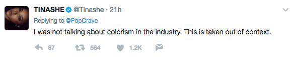 However, Tinashe says when she was discussing colorism, it was taken out of context. See her explanation below.